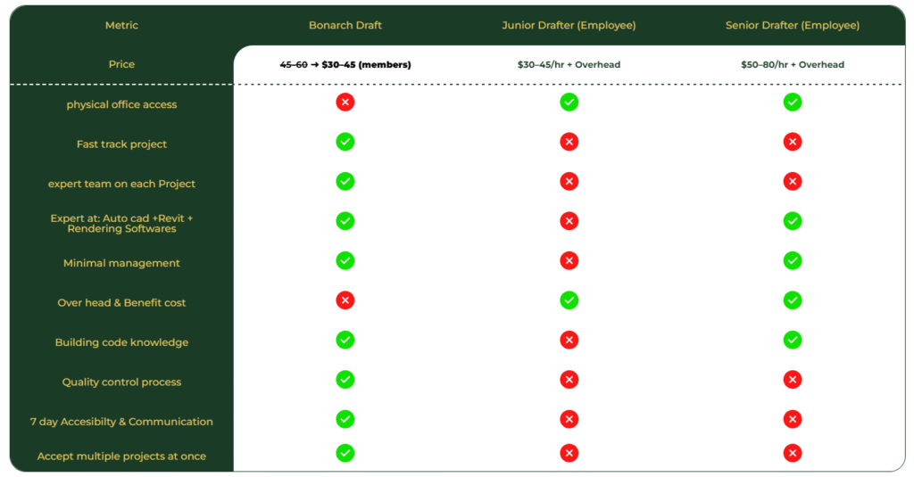 You get the speed and skill of an in-house drafting team — without the overhead, hiring, or uncertainty.